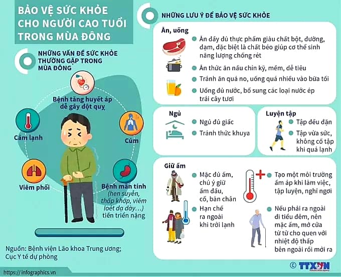 Do đó, lưu ý quan trọng hàng đầu là giữ ấm cho người cao tuổi; tuân thủ chế độ điều trị của bác sĩ nếu đang phải điều trị bệnh mạn tính; và thực hiện các khuyến cáo phòng bệnh của ngành y tế.