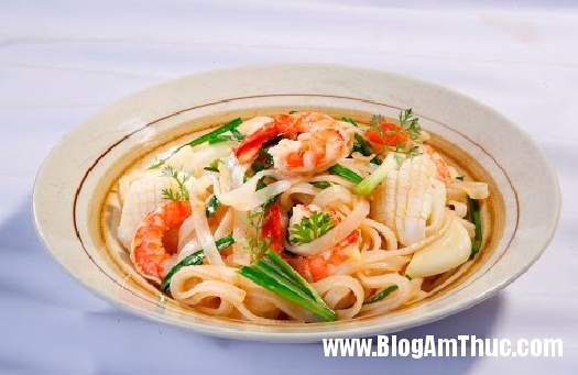 – Cho sốt chua ngọt vào đảo đều cho bánh phở ngấm gia vị, cuối cùng cho ớt thái sợi vào cùng cho tôm mực vào cùng hành lá đảo đều và tắt bếp.