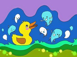 Hôm nay, Vịt con được mẹ cho ra sông tắm mát. Vịt con thích lắm. Vịt con đằm mình trong dòng nước. Những giọt nước bé tí xíu tinh nghịch rủ nhau trèo lên lưng, lên đầu Vịt con rồi lại lăn xuống mặt nước.